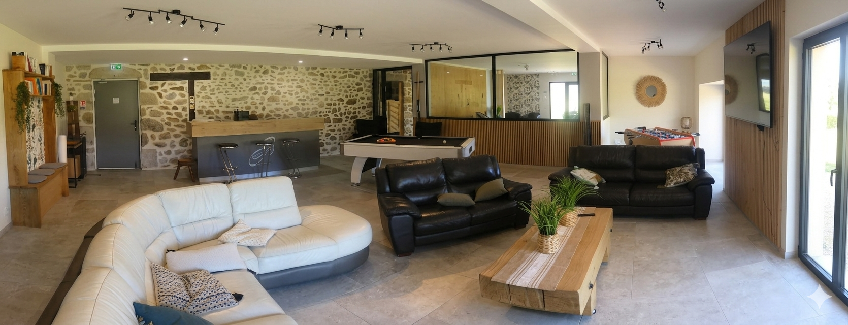 Bar, baby-foot, billard, home cinéma.